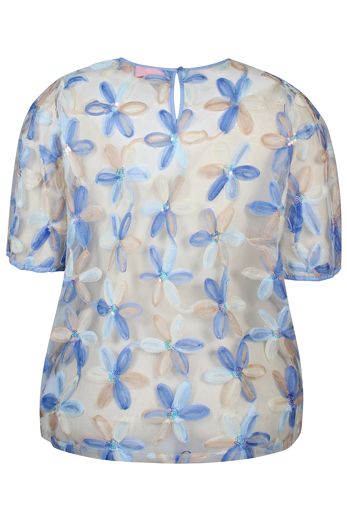 A light and eye-catching blouse with delicate floral decorations, subtly detailed with sequins that reflect the light. The sheer fabric adds an airy feel, while elasticated sleeve cuffs bring gentle structure. A small back neck button closes the look with a simple, refined touch.
