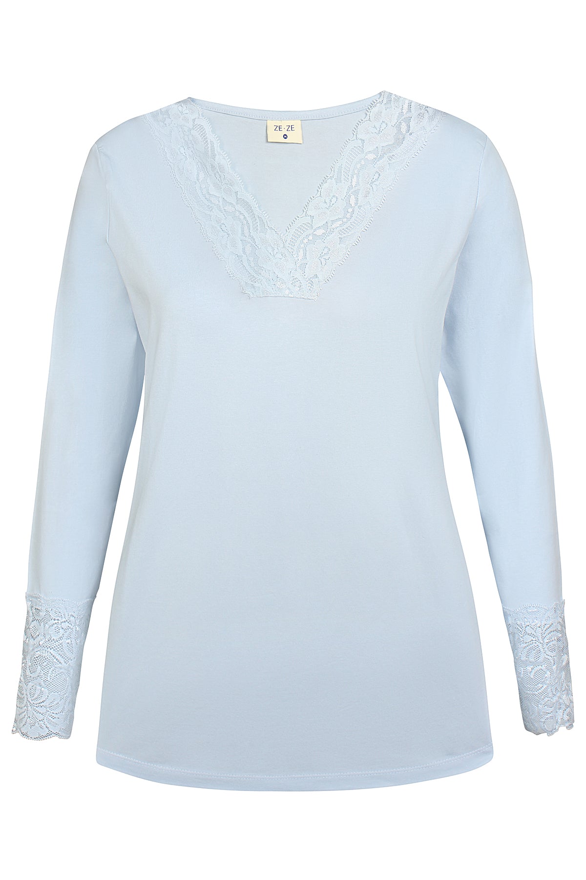 Camma 004 from ZE-ZE is an elegant and feminine T-shirt crafted from soft cotton, featuring beautiful lace trims that add a romantic touch. The deep V-neckline is accentuated by delicate lace, which is also echoed on the wide lace cuffs of the long sleeves.