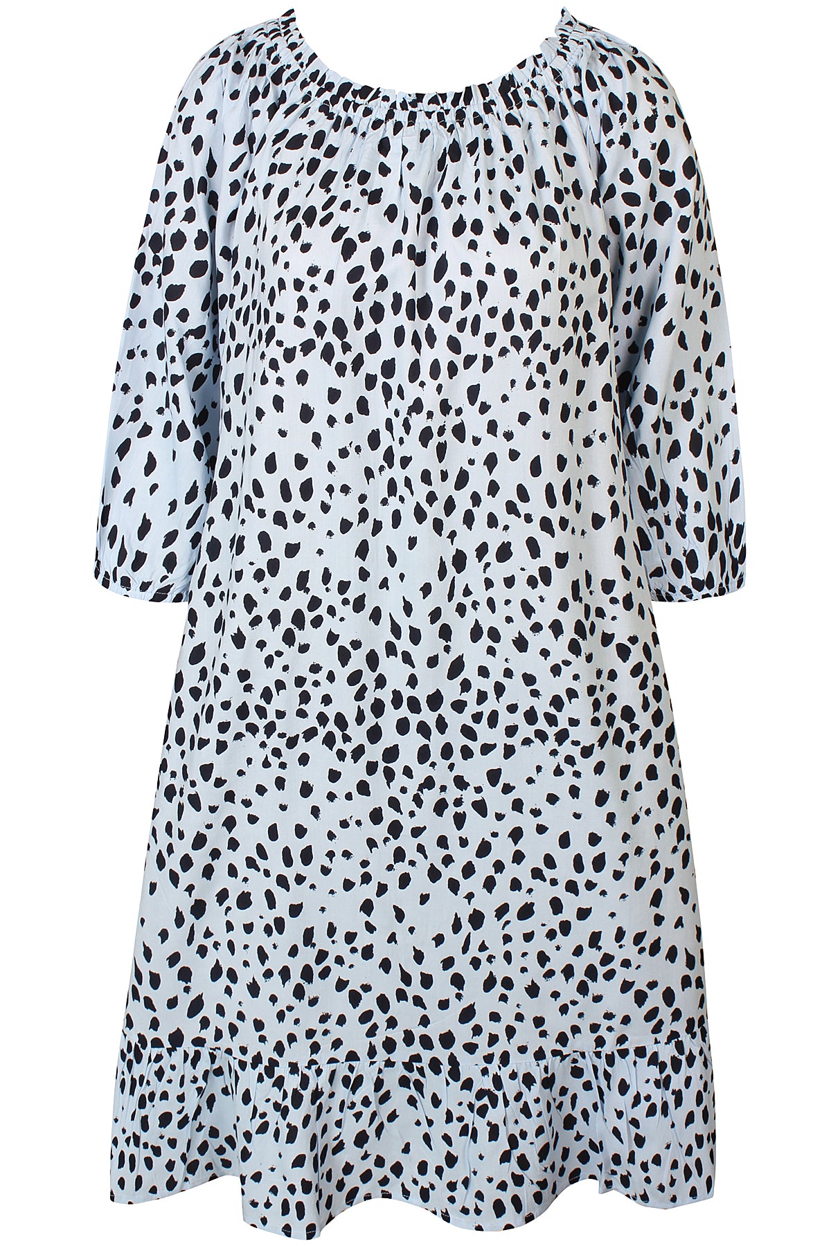 The design includes elastic cuffs and an elegant frill detail at the hem, adding a feminine and playful touch. With a length of 100 cm in size M, this dress offers a comfortable fit that’s easy to dress up or down.