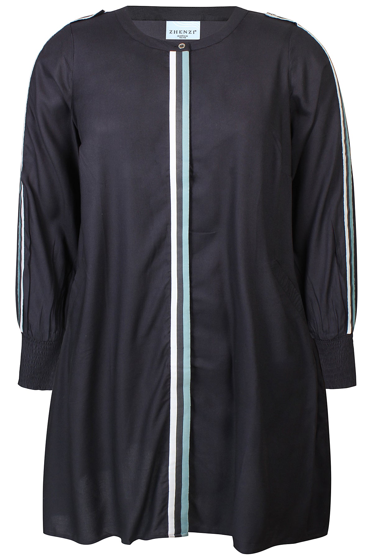 ALLIE 1192 is a modern and comfortable dress made from 100% viscose with a sporty twist. It features contrast stripes running down the sleeves and the center front, giving it a cool and dynamic look. The discreet front button closure is hidden to maintain a clean and minimal design.