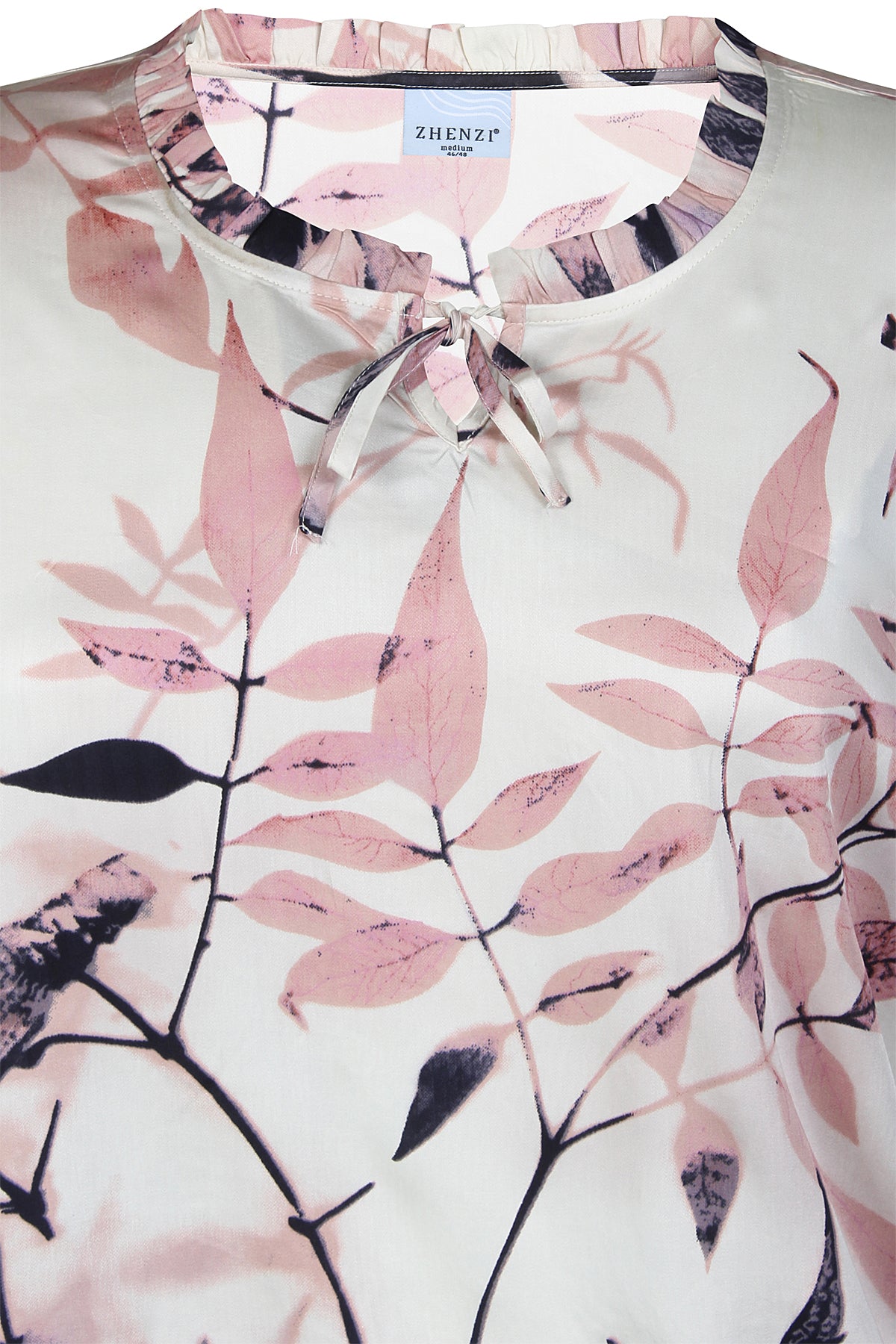 ANGEL 1331 is an elegant and feminine blouse made from 100% viscose, featuring a beautiful botanical print. The design is full of delicate details – a soft V-neckline with tie closure and subtle frills around the neck add a romantic and relaxed touch.