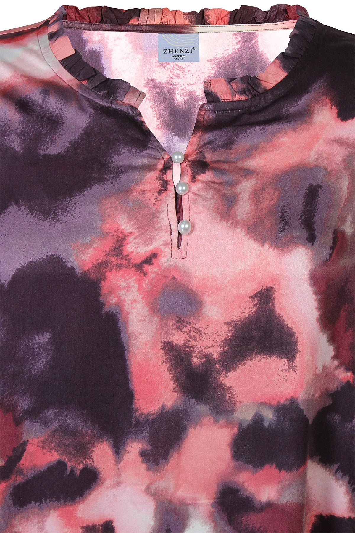 ANIKA 1204 is a stylish and comfortable tunic with a dreamy all-over print in soft tones. It features a feminine V-neckline with elegant pearl button details, adding a delicate and refined touch to the relaxed design.