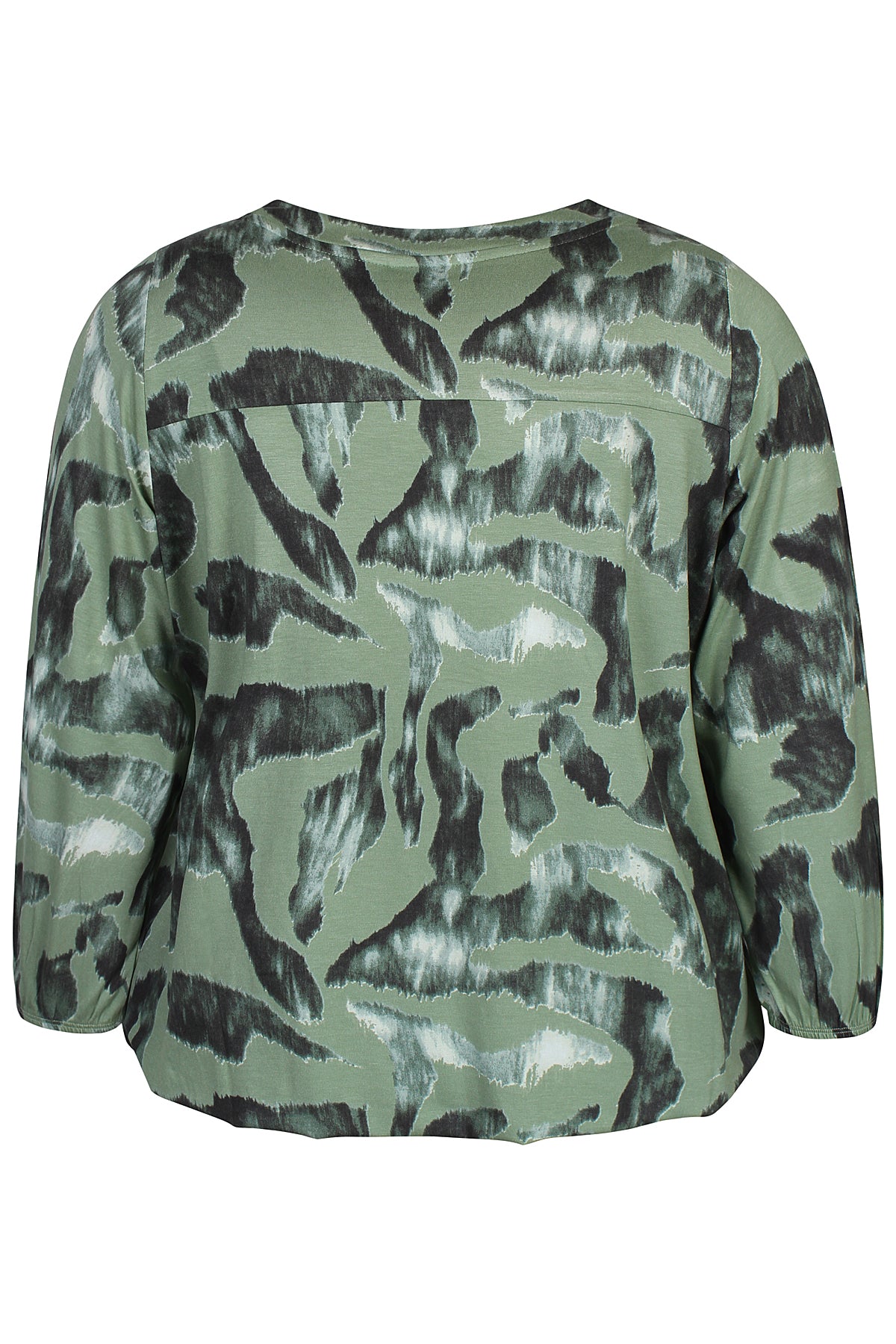 This relaxed blouse features a vibrant print and a V-neckline, making it a versatile option for everyday wear. The 3/4 sleeves and elastic edges at the hem and cuffs give it a softly shaped silhouette that fits comfortably.